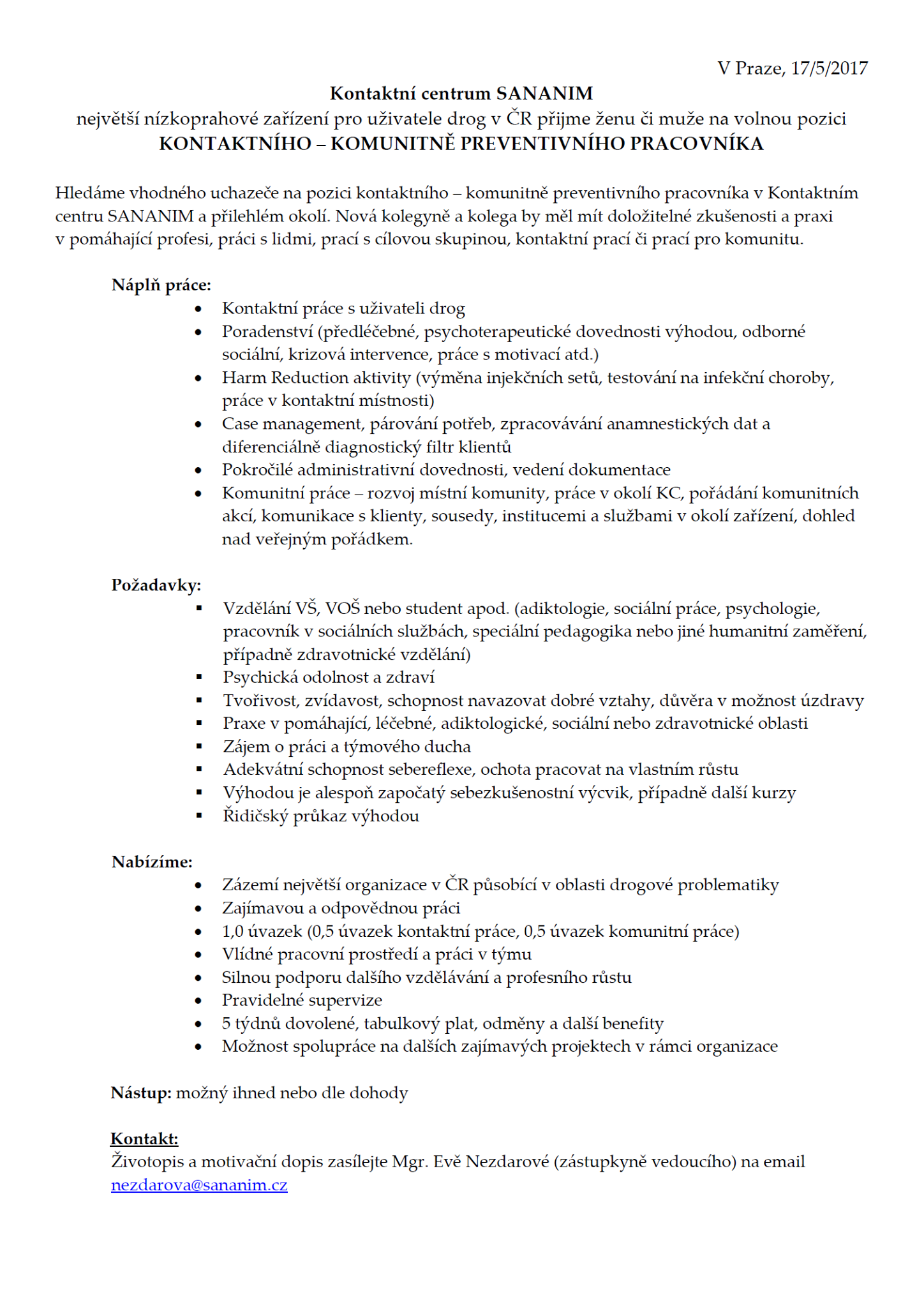 Nacházíte se zde: Úvod > Absolventi > Nabídka pracovních míst > Všechny nabídky - interní > Kontaktní centrum SANANIM, Praha, kontaktní-komunitně preventivní pracovník