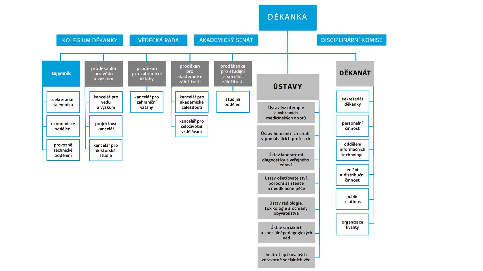 KFE - Katedra filozofie a etiky v pomáhajících profesíchKKO - Katedra klinických oborůKLZ - Katedra laboratorních metod a zdravotnické technikyKOS - Katedra ošetřovatelstvíKPR - Katedra právních oborů, řízení a ekonomikyKPO - Katedra preklinických oborůKRA - Katedra radiologie a toxikologieKSB - Katedra sociální práce a sociální politikyKSU - Katedra supervize a odborné praxeKVZ - Katedra veřejného a sociálního zdravotnictvíÚstav sociální práceEkonomické odděleníTechnické odděleníOddělení Správy informačních sítí (SIS)Personální odděleníStudijní odděleníKnihovnaOddělení pro doktorská studiaOddělení pro celoživotní vzděláváníOddělení zahraničních vztahůVědecká radaAkademický senátKancelář děkanaDisciplinární komiseDěkan fakultyTajemníkproděkan pro vědu a výzkumproděkan pro pedagogickou činnostproděkan pro rozvoj a vnější vztahyKatedry