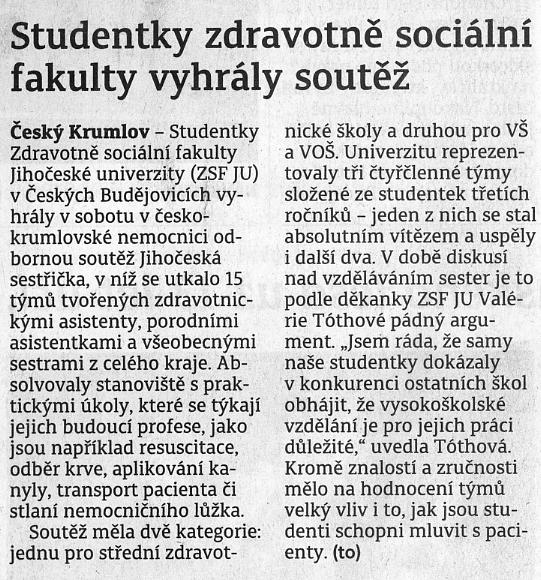 Celkové vítězství i prvenství v kategorii 3. ročníků VOŠ a VŠ zajistily naší fakultě studentky třetího ročníku oboru Všeobecná sestra Karolína Švecová, Michaela Tušlová, Iveta Příplatová a Anna Vodičková (tato dívka navíc překonala všechny ostatní závodníky v disciplíně stlaní nemocničního lůžka). Rovněž druhý tým ZSF JU zastupoval obor Všeobecná sestra: studentky Anna Krutská, Michaela Lidová, Kateřina Laierová a Andrea Jenerálová obsadily bronzovou příčku. Páté místo patří družstvu třetího ročníku oboru Porodní asistentka ve složení Michaela Vítovcová, Martina Rozmilerová, Dominika Cvejnová a Michaela Neubergová, což je rovněž velký úspěch, protože soutěžní otázky vycházely ze znalostí a dovedností všeobecných sester, nikoli porodních asistentek.